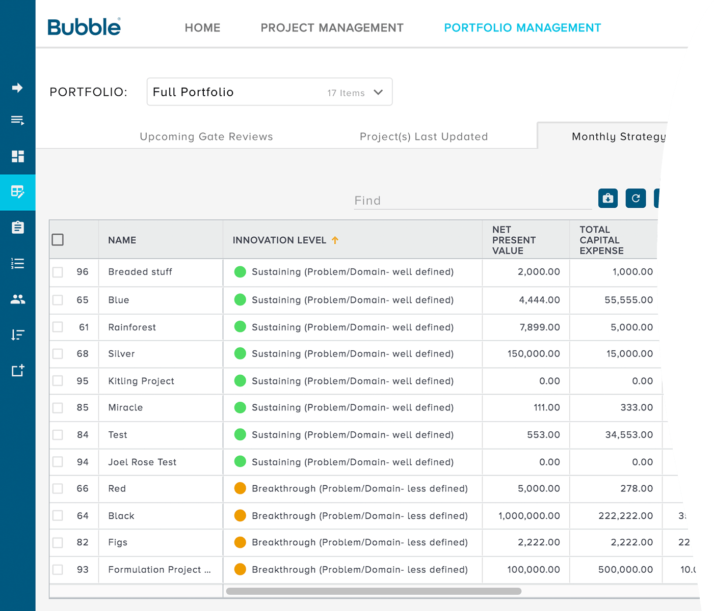 Bubble PPM makes it easy to roll up financials and other metrics to the portfolio level for monitoring, manageing, and reporting. compare different Project types on equal terms. Track budgets, expense, revenues, and other metrics for fixed, hypothetical, or ad-hoc portfolios.