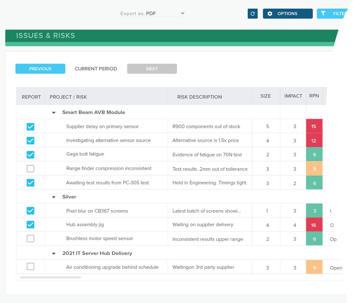 Elements Data can be sorted and grouped by reporting periods, ownership, status, liklihood, or other factors, then exported for further analysis or reporting purposes.