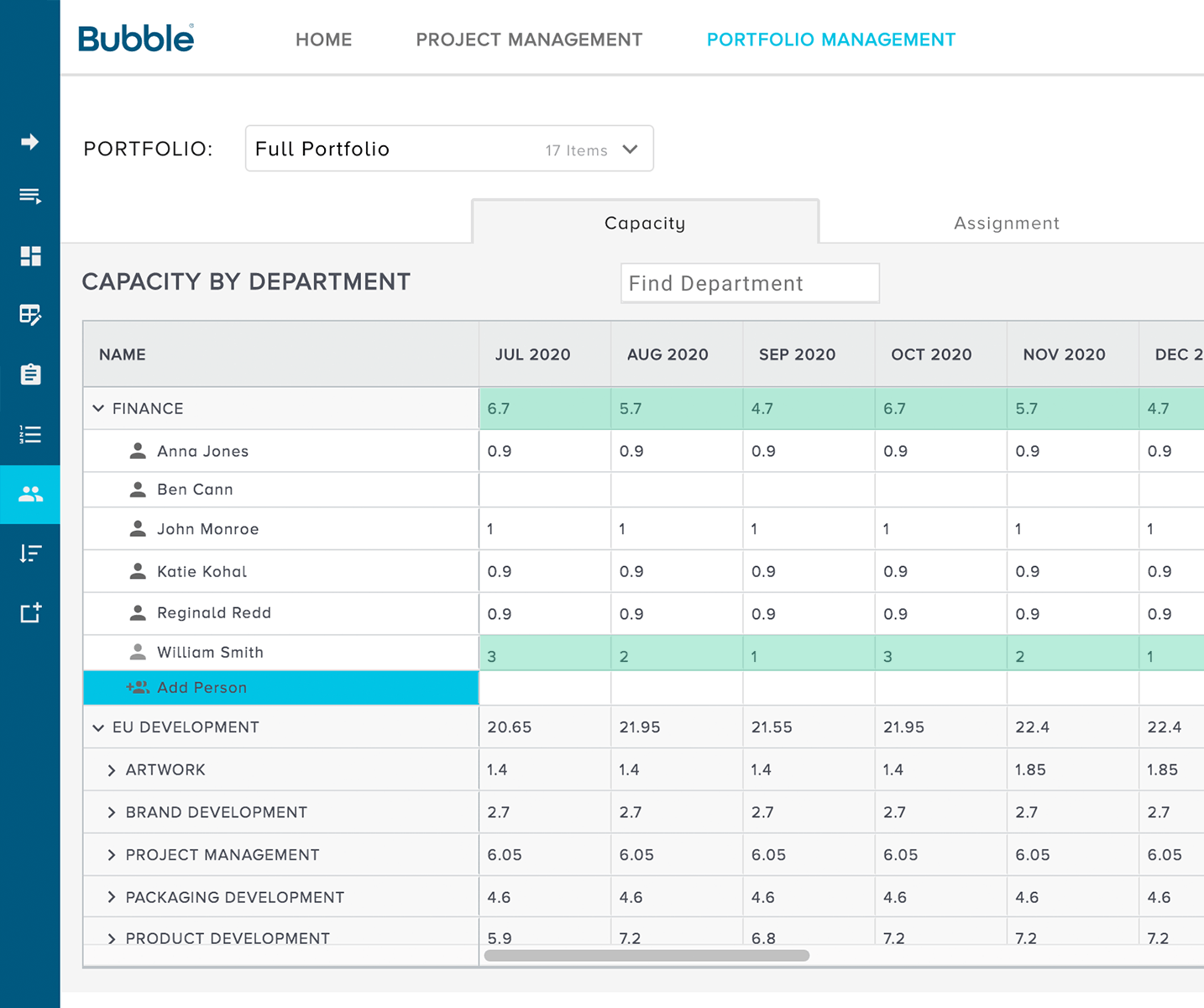 See the capacity of any person, the projects they're on, the time on a given project, and their remaining capacity.